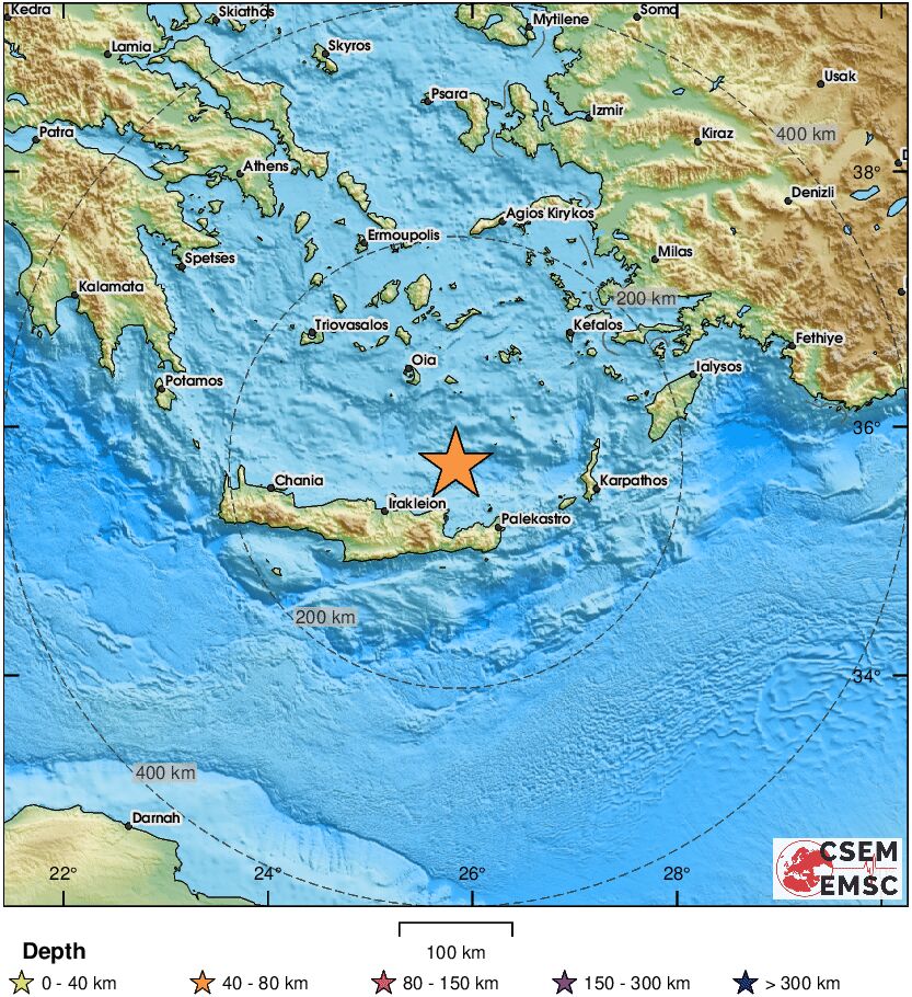 Силен земјотрес со јачина од 6,1 степени според Рихтеровата скала го погоди морскиот регион североисточно од грчкиот остров Крит утрово во 6:19 часот по локално време, објави грчки Катимерини. Епицентарот бил лоциран 58 километри североисточно од Елунда, на длабочина од околу 60 до 69 километри, според различни проценки од Европскиот сеизмолошки центар (EMSC) и Американскиот геолошки институт (USGS).