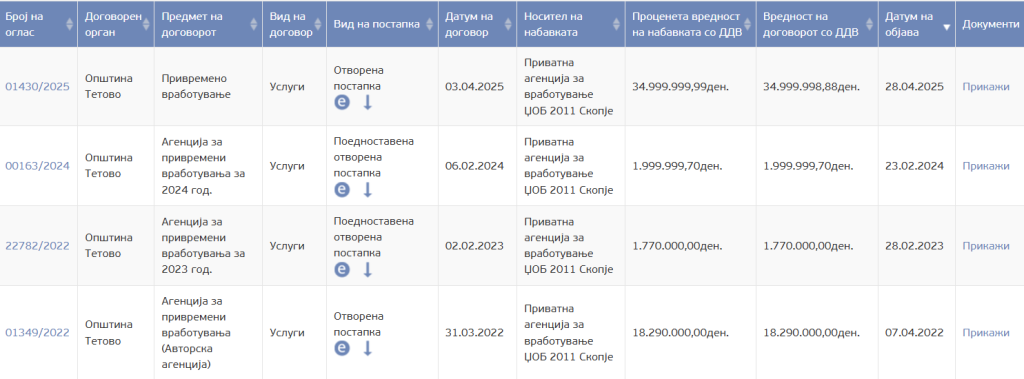 Само Општина Тетово има потрошено 57.059.998 денари или 927.326 евра за четири договори кои ги има склучено во 2022, 2023, 2024 и 2025 година. Тоа што може да се види е дека во 2025 година, изборна година, вредноста на договорот е повеќекратно поголема од претходните години.