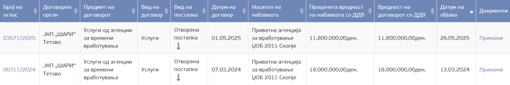 ЈКП „Шари„ пак има склучено договори само во 2024 и 2025 година, бидејќи ова претпријатие е ново, и за овие две години ова претпријатие има склучено договори во вредност од 29.800.000 денари или 484.303 евра.