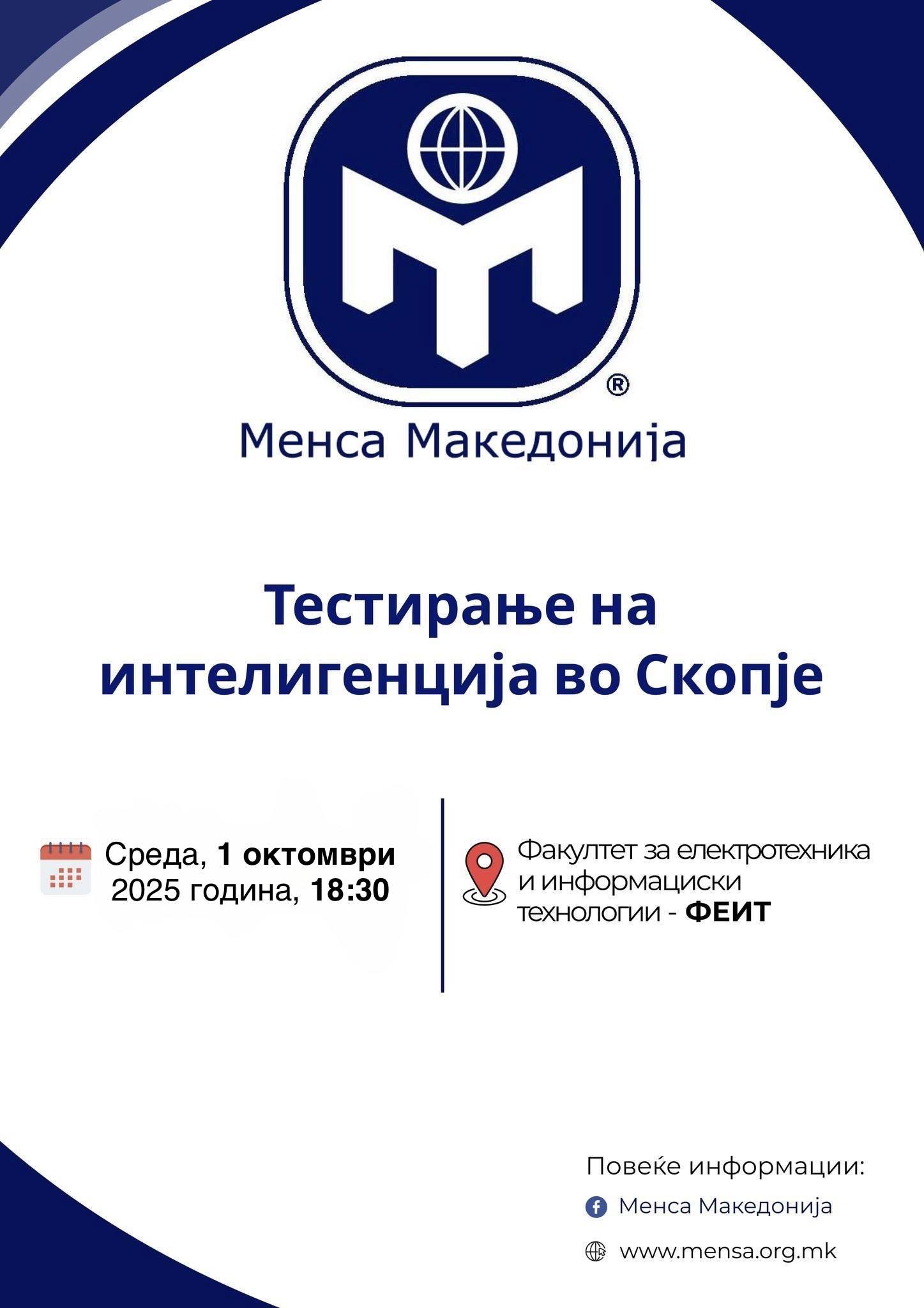 По повод Први октомври, светскиот ден на интелигенцијата, Менса Македонија, во среда, ќе организира тестирање на општата интелигенција со цел прием на нови членови. Тестирањето ќе се одржи на Факултетот за Електротехника и Информациски Технологии, а может да се пријават сите кои имаат полни 16 години, претходно да не се тестирале повеќе од два пати и од претходното тестирање да се поминати најмалку 6 месеци.