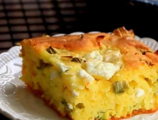 Ситно исечкајте го празот и пржете го кратко во малку масло додека не омекне. Оставете да се излади. Изматете ги јајцата во голем сад, додадете јогурт и масло, а потоа измешајте. Додадете ги обете брашна, прашокот за пециво, солта, издробеното фета сирење и пржениот праз. Сè измешајте во компактна смеса (ќе биде малку погуста). Истурете во плех премачкан со масло (или обложен со хартија за печење). Печете во претходно загреана рерна на 200°C околу 30-35 минути, додека не добие златна кора. Оставете да се олади и исечете на коцки.
