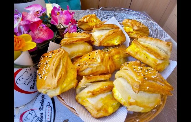 Последната не ја мачкаме. Развлечете ги корите во долг правоаголник. Исечете на ленти, потоа на мали правоаголници и наполнете го со сирење измешано со едно јајце. Горната страна ја преклопуваме и се редиме во плех.