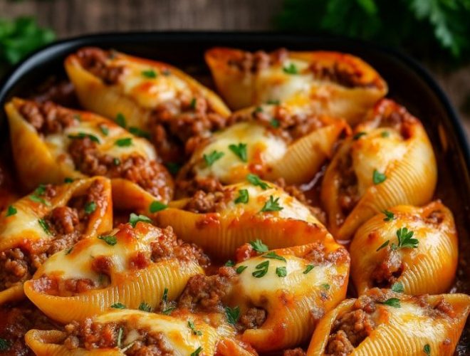 Овој рецепт е совршен за љубителите на италијанската кујна, семејствата кои бараат вкусни и задоволувачки оброци и секој што сака да проба нешто ново. Полнетите школки од тестенини комбинираат ароматично мелено месо, стопено сирење и миризливи зачини во совршено хармоничен залак.