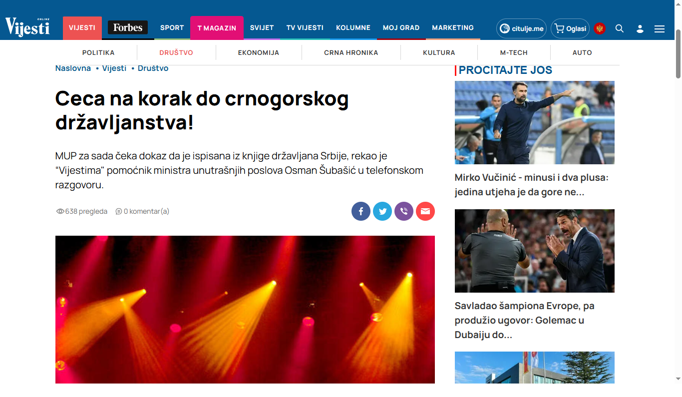 Принтскрин од написот на Вјиести за Цеца и нејзиното црногорско државјанство
