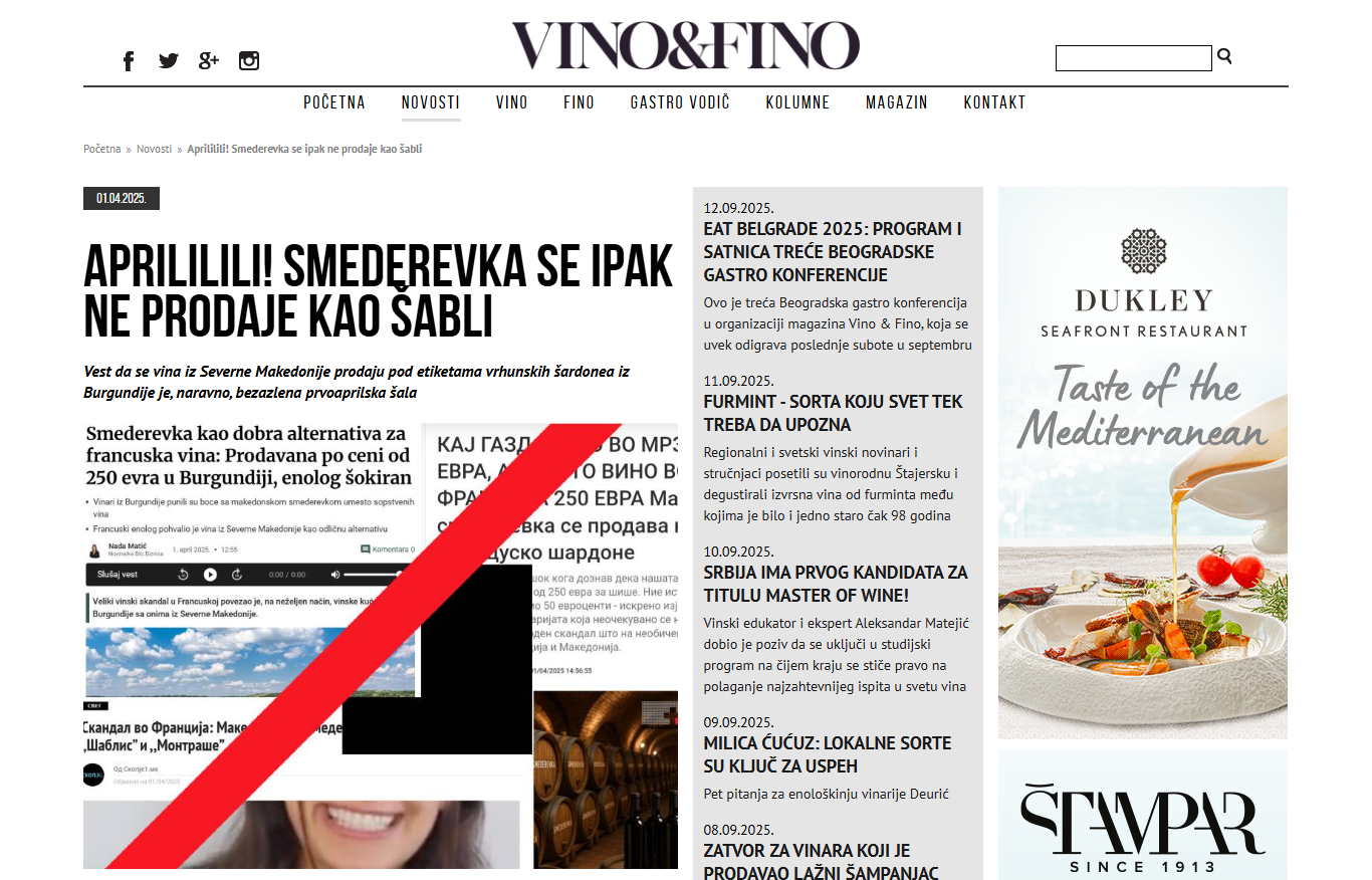 Принтскрин од текстот на српскиот портал „Вино и фино“ каде обелоденуваат дека станува збор за шега