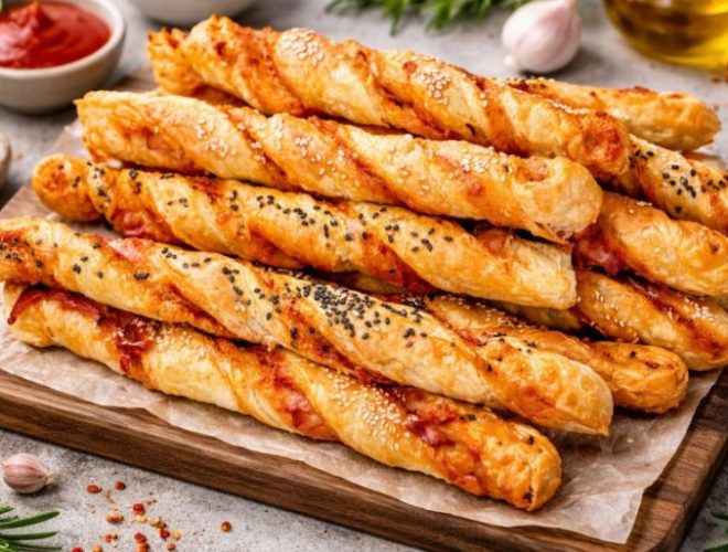 Одвиткајте едно лиснато тесто и ставете го на хартија за печење. Рамномерно намачкајте го со доматно пире. Распоредете ја сланината по целата површина. Посипете со рендано чедар сирење. Покријте со другото лиснато тесто и нежно притиснете ги рабовите заедно со вилушка. Исечете го тестото на ленти (околу 10–12 парчиња). Свртете ја секоја лента во спирала. Распоредете ги стапчињата на плех, премачкајте со изматено јајце и наросете со сусам. Печете во претходно загреана рерна на 200°C околу 20 минути, додека не станат златни и крцкави.