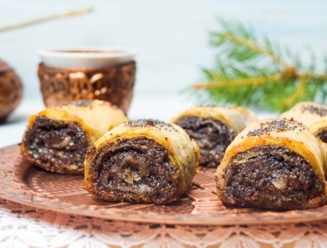 Фил: Измешајте ги афионот, оревите, шеќерот, прашокот за пециво. Земете една кора, премачкајте ја со масло, ставете друга кора одозгора и премачкајте ја со масло, потоа на 2 см од работ на кората, ставете пет лажици фил по должината на кората и замотајте ја. Направете го истото со остатокот од корите и филот. Наредете ги ролатите на намастен плех, еден до друг. Исечете ги на парчиња со посакувана должина, премачкајте ги со масло и печете ги во претходно загреана рерна на 200 степени додека не поруменат. Прелијте го ладниот сируп врз топлата баклава.