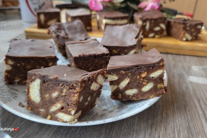 Исто така, поделете ги бисквитите, потоа сомелете ја едната половина, а другата половина со раце издробете ја на поголеми парчиња за да можете да ги почувствувате под забите. Додадете кикирики, ореви и двата вида бисквити во топлата смеса со чоколадо, па добро измешајте сè за да добиете густа маса.