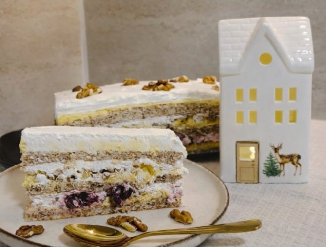Совршена комбинација од меки кори од ореви, богат жолт фил и освежително овошје. Оваа торта е идеална за прослави, родендени и посебни пригоди кога сакате десерт што остава впечаток.