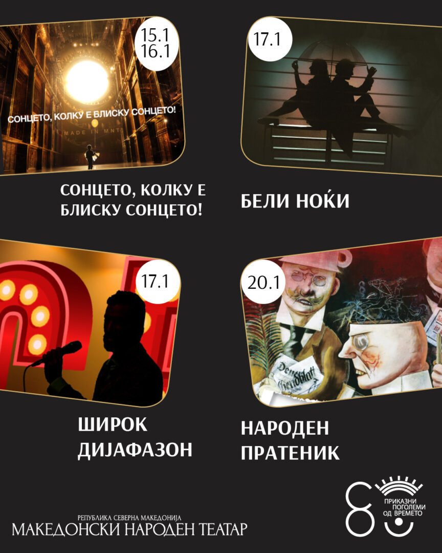 Македонскиот народен театар, 2026 година ја започнува со силен уметнички интензитет и разновидна театарска програма. Првиот месец во годината носи богат репертоар, кој опфаќа сценски спектакли, современи и класични драми и стендап-изведби на големата и малата сцена.