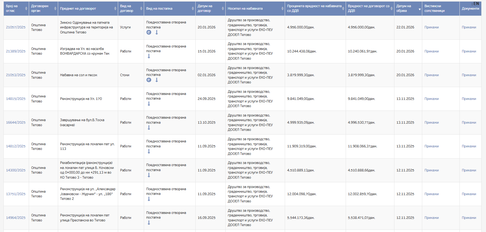 • „Еко Пеу“ (Тетово): Оваа компанија е најголемиот добитник, со два договори кои