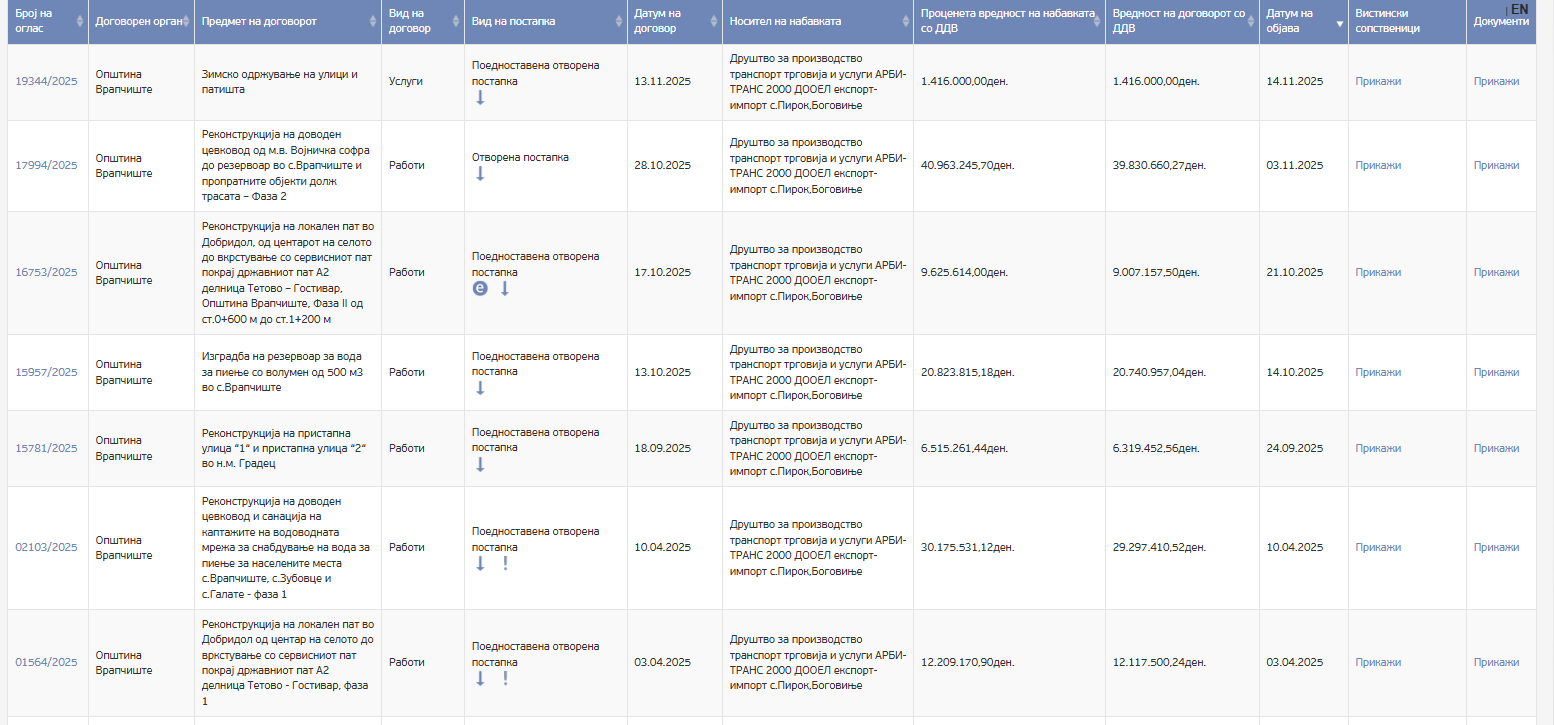 вредност од 1.200.000,00 денари без ДДВ (над 19 илјада евра). Оваа компанија во 2025 година добила уште осум други тендери од oпштина Врапчиште, за реконструкција на патиштата, изградба на резервоари со вода и реконструкција на цевките.