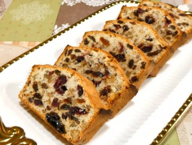 Добро изматете ги белките, потоа полека додадете шеќер, масло, брашно, рендана кора и сок од лимон. Посипете ги сувото грозје со малку брашно и измешајте ги со раце за да не се залепат зрната. Додадете го во смесата од белки, како и ситно сечканите смокви и ореви, ренданата кора и сокот од лимон.
