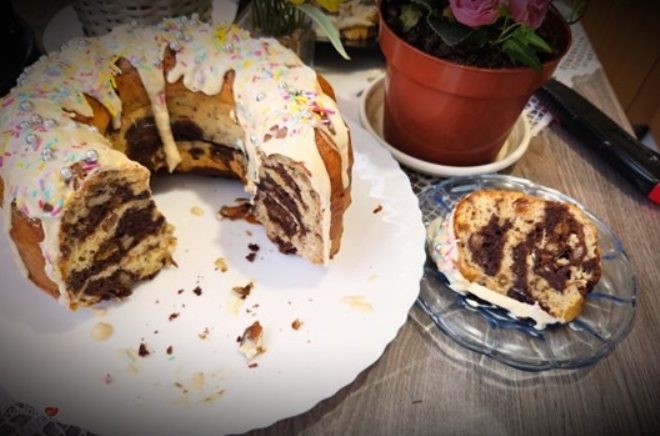 Добро премачкајте го калапот за куглоф со путер ако не е од силикон, потоа наизменично распоредувајте во круг од светло и круг од темно тесто додека не се потроши целото. Печете во претходно загреана рерна на 180 степени C околу еден час додека убаво не порумени и не се одвои од рабовите.