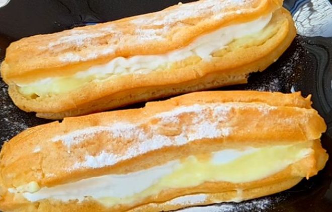 Исечете ги еклерите, прво наполнете ги со жолта крема, па наросете шлаг одозгора. На крајот, посипете сè со шеќер во прав за да изгледаат како вистински мали деликатеси.
