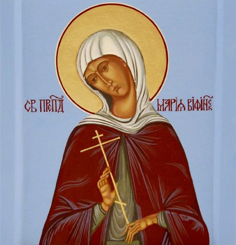 Девојка со машка храброст. По смртта на нејзината мајка татко и посака да се замонаши. Но Марија не сакаше да се раздели од својот татко, па по договор обајцата се упатија во еден машки манастир, и тоа Марија со потсечена коса и во машка облека, како момче. Умре татко и , а Марија се замонаши како машко и го доби името Марин. Во близина на манастирот имаше гостилница и ќерката на гостилничарот се загледа во божемниот монах Марин и откако неуспешно го искуша, го обвини овој монах за недопустлив однос со неа, а таа со некого зачна и роди син. Марија не се бранеше, па беше понижена и избркана од манастирот. Со туѓо дете на рацете проживеа пред портите на својот манастир три години трпејќи глад и студ и секаква мака и немаштија. По ова ќерката на гостилничарот полуде, а наскоро потоа Марија умре. Дури по смртта се дозна дека т.н. монах Марин бил женско. А кога лудата ќерка на гостилничарот се допре до моштите на Св. Марија, оздраве и потоа го призна својот страшен грев. Св. Марија се упокои и се пресели во бесмртната радост во 508 година.