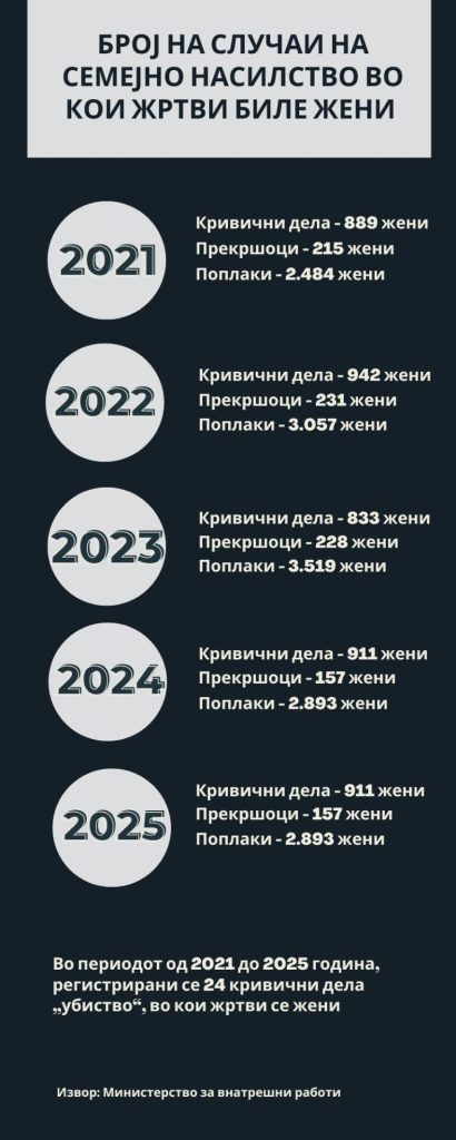 Рекордни 4.745 жени пријавиле семејно насилство во 2025 година во Македонија, покажуваат бројките на Министерството за внатрешни работи (МВР), во кои спаѓаат кривични дела, прекршоци и поплаки од семејно насилство. Ако се погледнат бројките од последните пет години, состојбата е загрижувачка. Најчесто сопругите се најпогодената група, што е аларм за воведување засилени мерки за нивна заштита и поддршка.