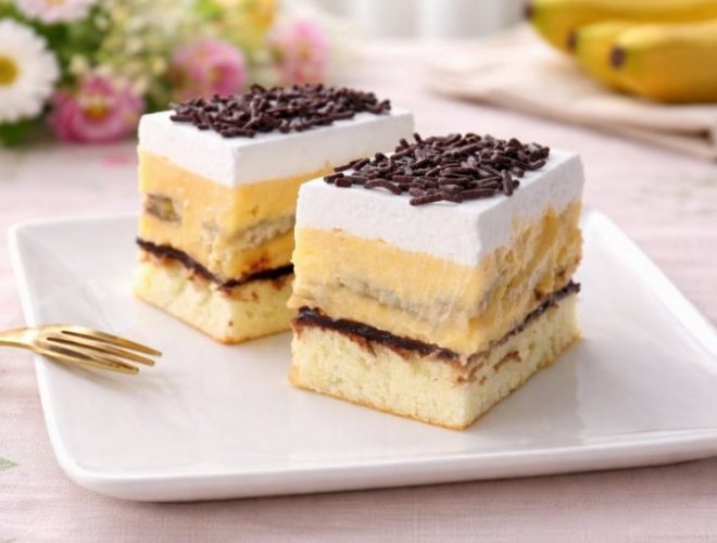 Совршено мек бисквит, слој од чоколаден намаз, нежен ванила крем и свежи банани – комбинација која секогаш функционира. Овој колач е идеален за семејни собири, родендени или кога сакате проверен, кремаст десерт кој е лесен за подготовка.