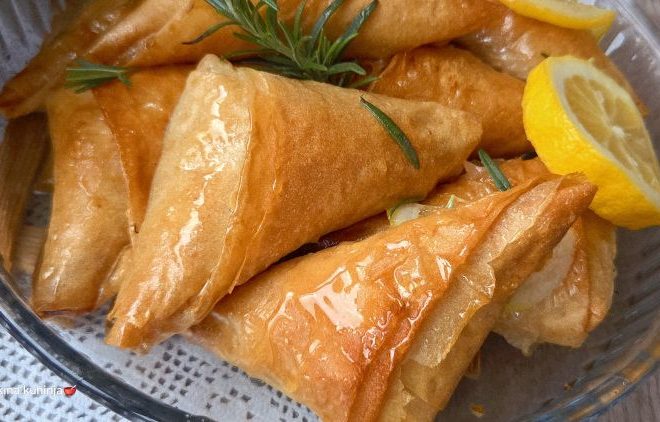 Ставете една лажица динстани јаболка и две лажички сечкани ореви на самиот почеток од лентата. Свиткајте во форма на триаголник и наредете ги во намастен плех. Премачкајте го секој триаголник со масло и печете околу 30 минути додека убаво не поруменат.